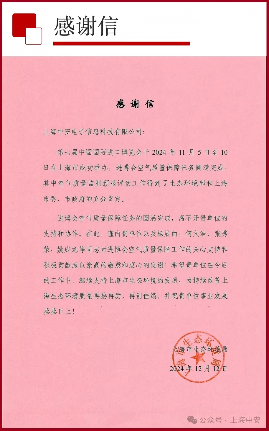 上海市生態(tài)環(huán)境局致上海中安的一封感謝信!(2025-01-10)